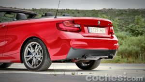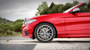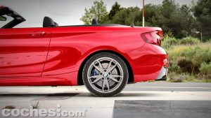 Mención aparte merecen todos los detalles que le separan de otros Serie 2 Cabrio con el paquete de equipamiento M. Además del paquete deportivo, que cuenta con paragolpes específicos, difusor trasero en negro o los espejos en grios, añade elementos como las específicas de 18 pulgadas de color Ferric Grey, que dejan ver un sistema de frenos sobredimensionadas con unas pinzas que lucen el logotipo M.