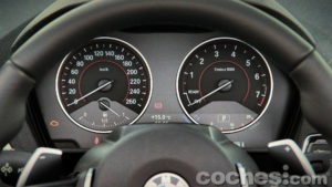 Tras el volante nos encontramos con una instrumentación algo austera para lo que acostumbran a presentarnos los coches actuales. Consta de las dos típicas esferas, con fondo negro, con el velocímetro a la izquierda y cuentarevoluciones a la derecha. El panel LCD es más grande que en versiones más convencionales y cada vez arrancas el motor dibuja el logotipo M235i para destacar que no conduces un coche cualquiera. Sin embargo, su visibilidad es algo limitada para ver toda la información que muestra.