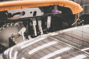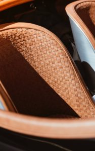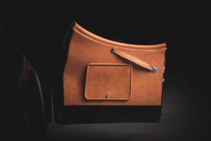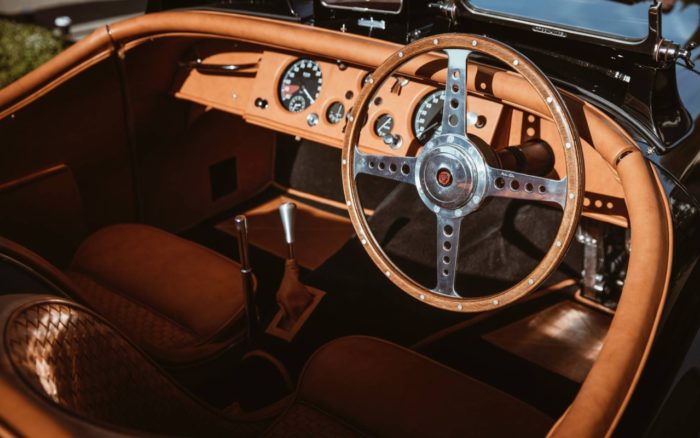 En el interior, la bienvenida está dada por un interior de cuero marrón envejecido y unos asientos diseñados a medida con los respaldos hechos en aluminio en lugar de la tela original. El volante también es un poco más pequeño –381 mm– y la batería se ha reubicado de sitio (antes tras el asiento del conductor) para liberar algo de espacio a su propietario, que mide 1,88 m de altura.